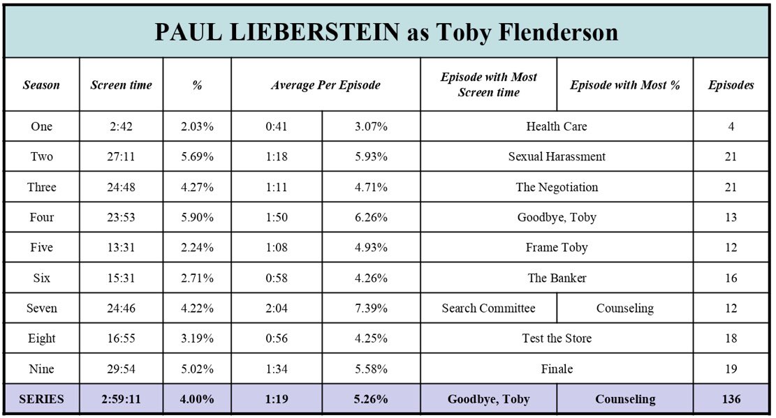 Matthew Stewart On Twitter 17 Paul Lieberstein As Toby Flenderson Total Screen Time 2 59 11 4 00 136 Episodes Top Episode 4 14 Goodbye Toby 7 19 7 2 Counseling 24 83 Https T Co Zeug7w2bos